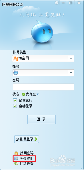 2、将下载好的阿里旺旺2015安装程序安装好,打开软件,在其登录界面,点击下方“免费注册”,打开免费注册页面。