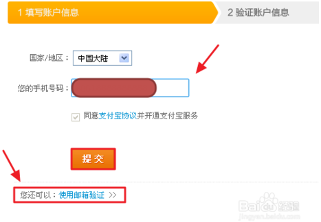 4、填写您的个人手机号码以便进行信息验证,您也可以使用邮箱进行验证。