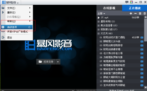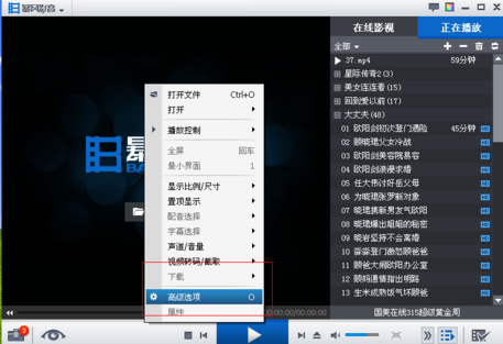 1、打开暴风影音,鼠标移动到播放器上,鼠标右键点击,选择【高级选项】