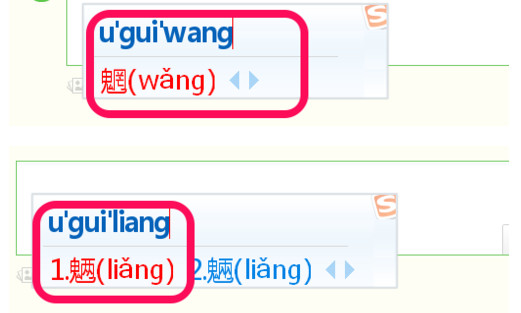 c、又或者是输入:魍魉 wǎngliǎng。把它拆成:鬼亡“uguiwang”和鬼两“uguiliang”,就造成了“魍”“魉”了。