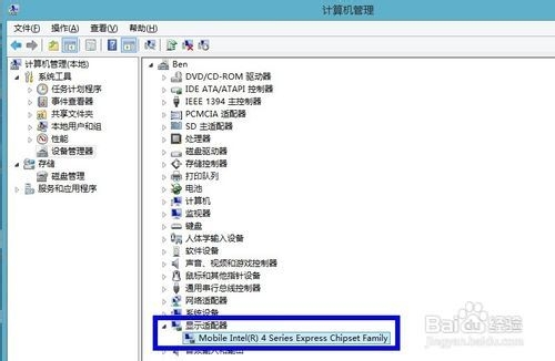 然后在右窗格中点击“显示适配器”,检查是否有叹号或者问号,如果有说明显卡驱动不正常。如图所示