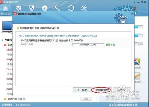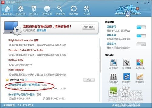 显卡驱动不正常,可以手动重新安装显卡驱动。如果自己没有显卡驱动,也不知道具体是什么显卡的话,可以借助一些第三方软件。这里以“驱动精灵2015”为例。首先打开驱动精灵2015,软件会自动检测系统的驱动。等待软件 检测完成以后,在首页找到显卡,点击“升级”如图所示