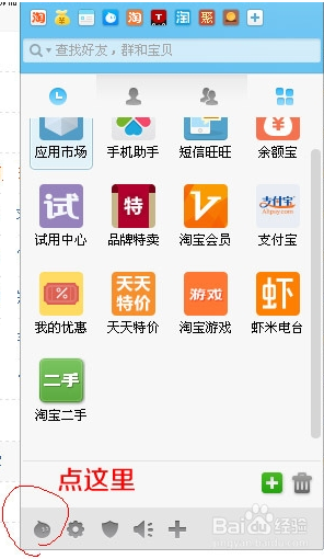 1、怎么找系统消息,打开阿里旺旺面板如图,不要在上面淘助手那里找,在左下角那里点击