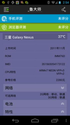 在此功能下共分为:概览、网络、电池盒特性四个小模块,从这四项中就可以对自己的手机有一个全面详细的了解。其中【概览】就是将手机硬件的基本信息罗列,共16项,内容相当详细,不仅有手机基本的型号、处理器、屏幕等,甚至连手机的重量、上市时间、参考价格等也有显示。