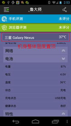 【电池】模块包括:电量、电压、温度、状态、充电状态、健康状态共6项。其中电池温度一项很重要,在我们为手机充电时,电池的温度最好在45℃以下,不然则会减少电池使用寿命,充电安全也得不到保障。相信很多用户都有手机发热的烦恼,在使用手机时,当电池温度超过50℃时则为危险信号,用户应暂时停止使用,或者关机来使电池温度恢复正常。PS:在这里提一下,在鲁大师手机版手机解析这个模块中,手机的“整体温度”显示一直是置顶状态。