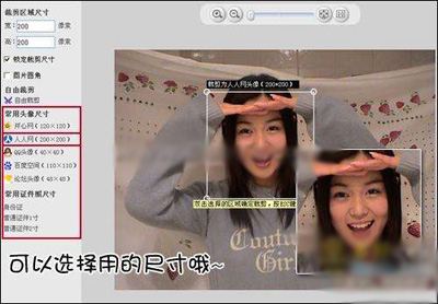 此外,经过我细心的观察,发现剪裁编辑框左侧还提供了很多常用头像尺寸,连身份证和证件的尺寸都有哦,嘿嘿这样就省去了自己调整设置的麻烦了。