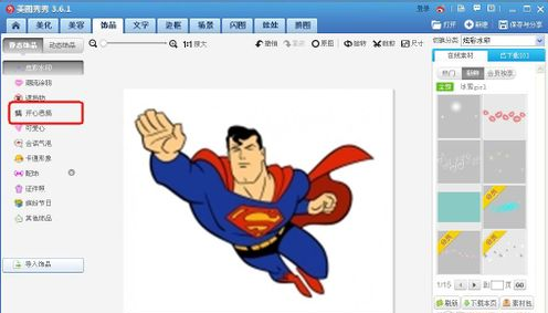 2、在美图中选中饰品选项,在饰品选项里面选定开心恶搞。(这里是用超人做的示范希望超人不会在意这点小细节)