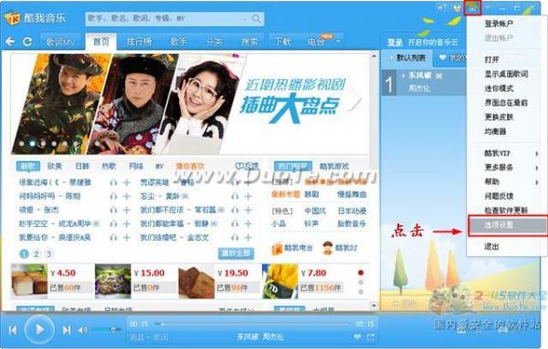 很多朋友找不到歌词保存路径,其实我们可以自己进行修改。点击软件右上角的小三角符号,在下拉菜单中选择“选项设置”,如下图: