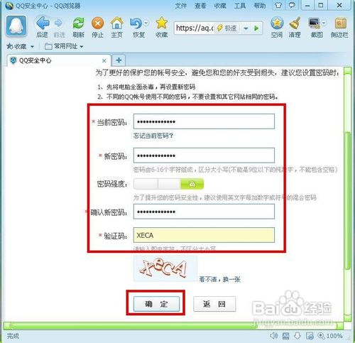 点击快速改密按钮以后进入修改页面,依次在页面上输入当前密码,新密码,再确认一下新密码,然后输入验证码点击确定