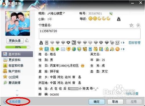 点击QQ头像以后就会出现我的资料窗口,然后在我的资料窗口鼠标点击左下角的系统设置按钮,进入系统设置