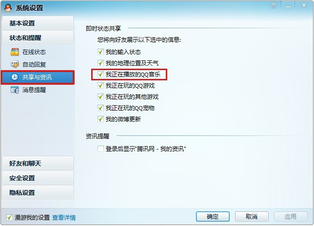 3、点击“我正在播放的QQ音乐”前的打勾,即可取消在QQ上显示正在播放的QQ音乐状态。