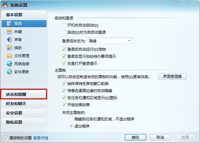 1、点击QQ面板下方的设置按钮,选择系统设置中的状态和提醒选项;