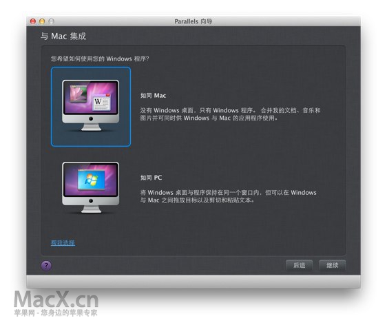 随后你会遇到一个选择, 两种模式. 第一个就是所谓的融合模式. windows的窗口会与mac的程序窗口一样出现在桌面上. 第二个是windows在一个窗口内独立运行. 这个选择就因人而异了.对于第一次使用 PD的用户来说我举得 第二种更容易区分.