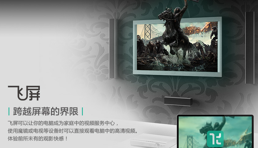 飞屏功能可以帮助您在暴风魔镜、智能电视中观看电脑中的高清视频。体验飞屏功能需要准备的设备有:电脑、路由器(建议使用无线路由器)、暴风魔镜或可以安装暴风影音电视版的智能电视或电视盒子。