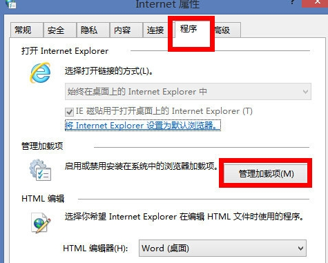 2、在弹出的对话框中选择“程序”——“管理加载项”。然后在右侧已经使用的加载项 中检查 wangwangX class是否存在或者是否是启用状态。