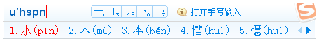 仅通过输入文字构成笔画的拼音首字母来打出想要的字。例如:【木】字由横(h)、竖(s)、撇(p)、捺(n)构成,因此: