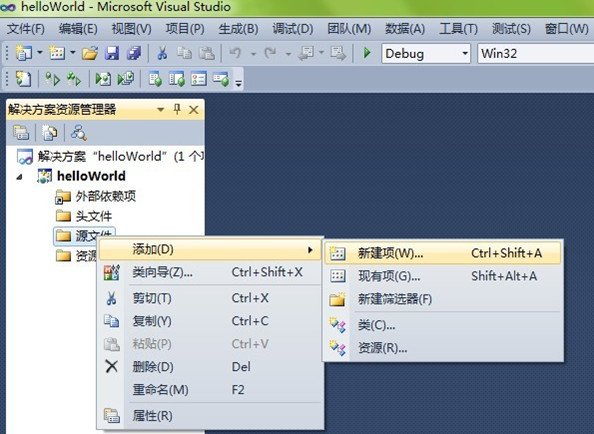 4、回到VS主界面,这时2会在左侧的多了如图的工具栏“解决方案管理器”(如果没出现请在“视图”中选择“解决方案资源管理器”),在“源文件”上点选右键,选择“添加”—“新建项”。(如果你已经有写好的C++源文件,那么要选择“现有项”)