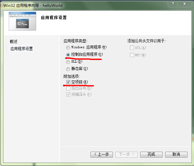 3、下面对话框中,“应用程序类型”要选择“控制台应用程序”,“附件选项”一定要选择“空项目”。然后点“完成”。