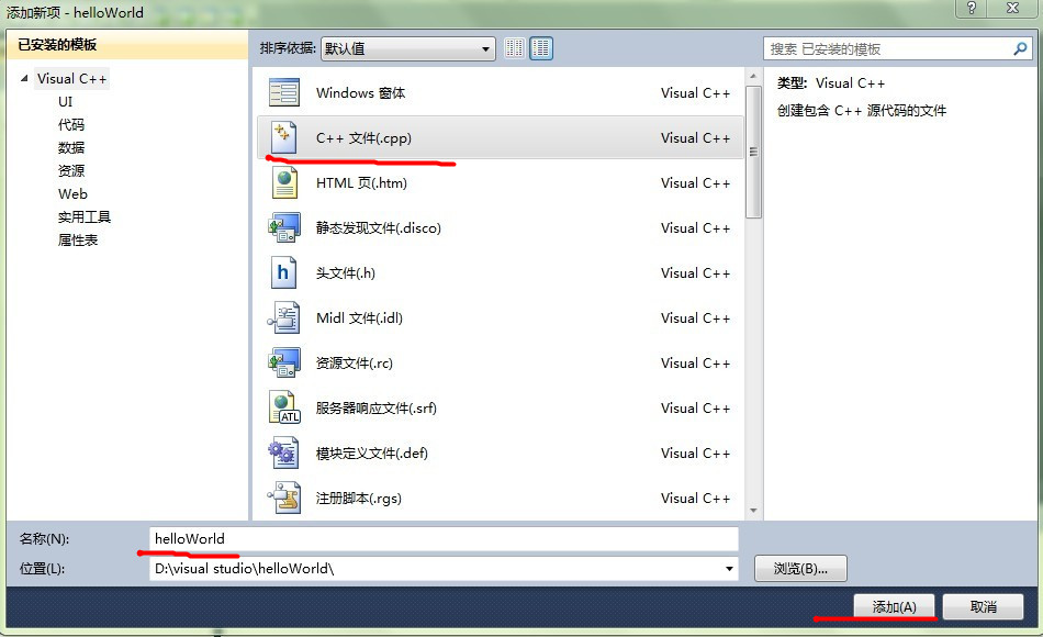 5、又打开个对话框,在模板中选择“C++文件”。在下面的文件中输入文件名称这里输入“helloWorld”,保存位置用默认。然后点击“添加”。