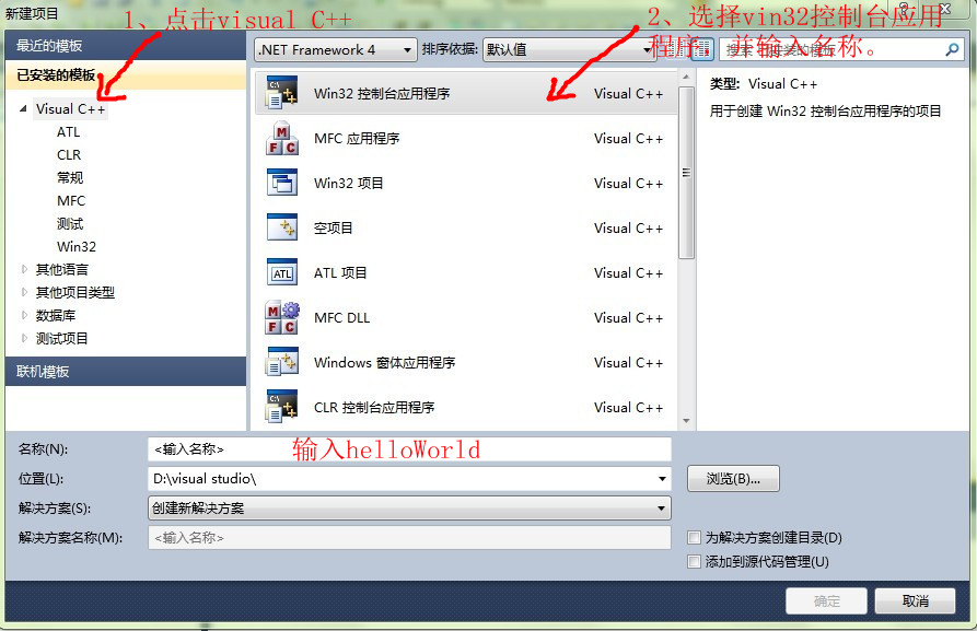 1、打开VS2010主界面,软后选择,“文件”—“新建”—“项目”,在项目类型中选择“Visual C++”,然后在右侧的模板中点选“Win32控制台应用程序”,并在下面输入一个项目名称。输入项目名称后确定。