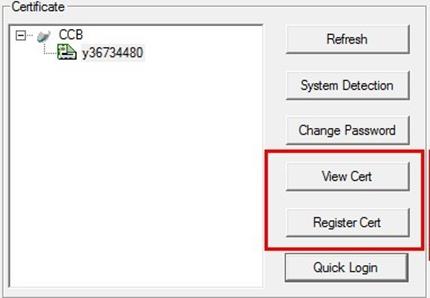 4. 您可以点击上图中所示红色区域内的 View Cert 按钮来查看当前的证书,最后需要您点击 Register Cert 按钮来向计算机注册此网银证书。