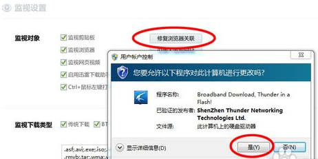 2、修复浏览器关联。选择我的下载后,在选择下面的监视设置。这时右侧会出现几个选项,选择修复浏览器关联,修复完成后会出现提示。