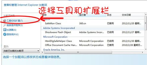 3、打开IE的管理加载项。打开IE浏览器,点击右上角的设置按钮,进入管理加载项,进入加载项的选择界面。