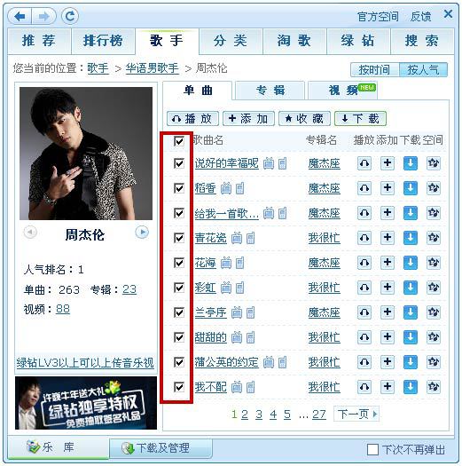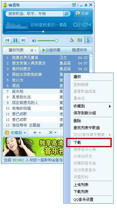 在播放器列表中多选歌曲后通过右键点下载或在QQ乐库专辑页面多选歌曲都可同时下载多首歌曲 选择多首下载后,将会弹出页面向你展示各下载资源,你可以选择下载