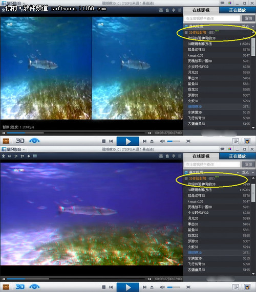 图3:播放在线3D电影《动物总动员》,3D键开启前、开启后