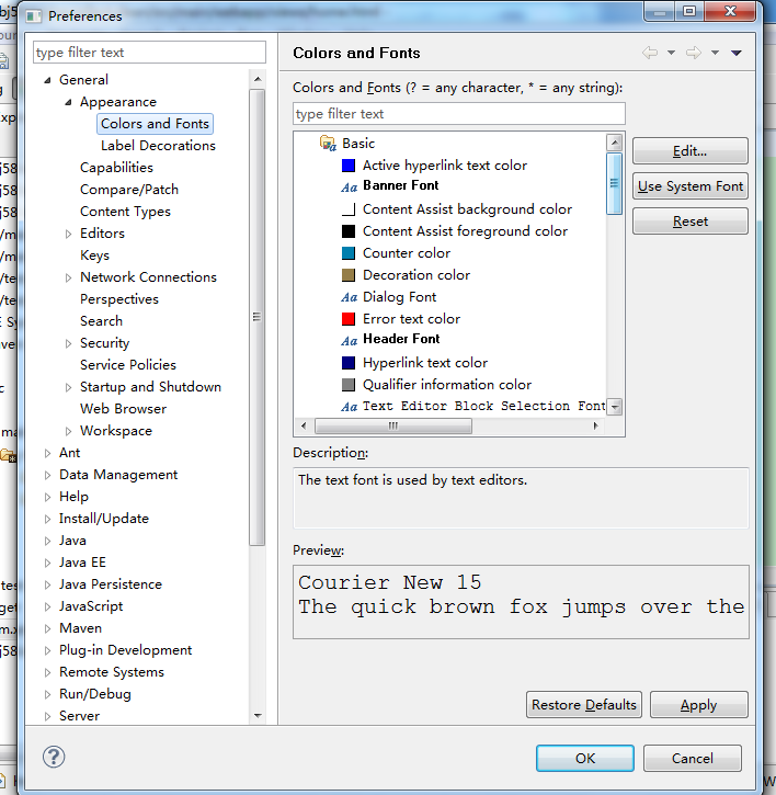 重装了系统,我一般都习惯把eclipse中的字体设的大一点,不过这次设置的时候还出了点问题,干脆记录下来方便以后再次使用。