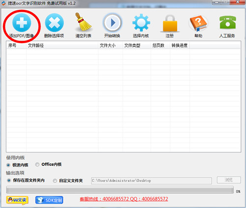 1、将软件下载并安装好,打开下载好的软件,直接进入操作主界面,点击上方左起第一个“添加文件”按钮,将需要识别的文件按提示添加到软件中。