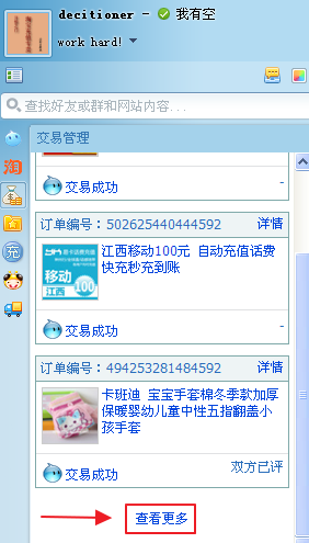 2、在阿里旺旺显示是最近几笔交易记录,如果要查看更多,可以移到交易记录最下方,点击“查看更多”。