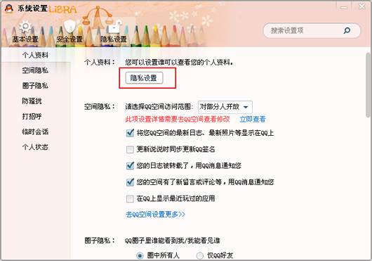 QQ2013版本操作示意图:打开系统设置=》隐私设置=》个人资料=》隐私设置。