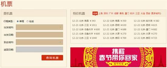 面对火车票的紧缺,对于归心似箭的游子而言,坐飞机回家过年也是不错的选择。特别是在长途返乡行程中,较之火车,坐飞机更快捷舒适。因此,本次专题页面还专门设计了“机票”版块,用户在这里不仅可以直接查询机票,还能提前了解特价机票信息。同样,点击查询后,页面也会跳转至携程网,就可以直接进入订购飞机票环节,省却了许多无关紧要的中间程序,有效提升了订票效率。