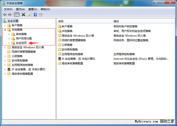 第二步:在“本地策略”中单击“安全选项”(如下图)。