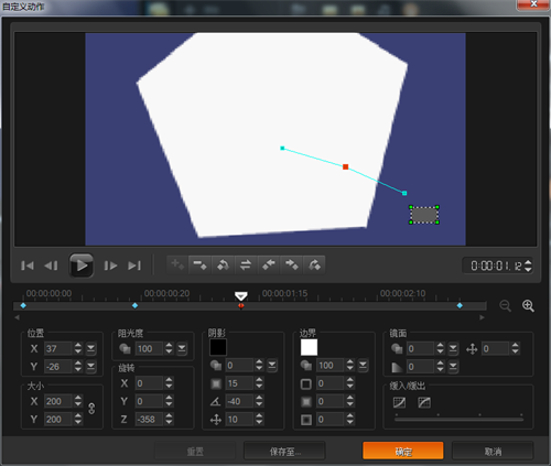 4、选中透明素材,右击鼠标,选择“自定义动作”,在第一点将素材拖至界面外,在17分的时间插入一点,调整大小为80跟角度,这个可以根据自己喜欢来,在1.12秒的时候,再插入一帧,调整大小为200以及旋转角度,最后一帧的时候将素材拖出界面外,点击“确定”即可。然后点击“文件”,选择“另存为”