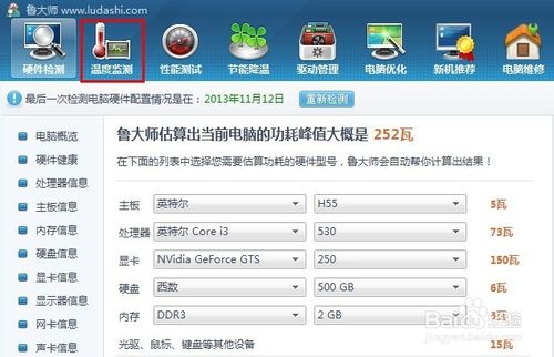 方法二:我们可以借用鲁大师工具来查看CPU的使用率。打开鲁大师以后点击窗口上面的【温度检测】开始。