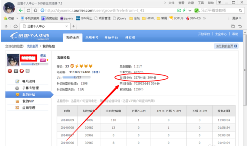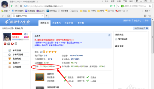 6、点击迅雷昵称,在浏览器上打开迅雷个人中心,这时打开的网页迅雷个人中心不需要再登录了,打开网页后就可以看到在线时长。