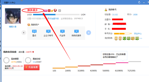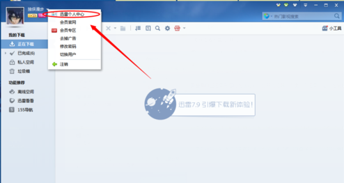 5、点击头像旁边的小三角,在下拉菜单中点击选中迅雷个人中心选项,打开客户端的迅雷个人中心,只是这个中心信息不是很详细。