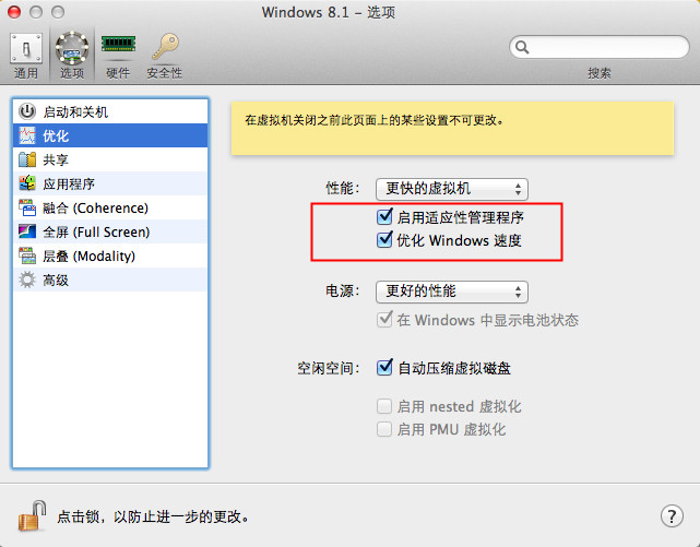 •选中启用适应性管理程序。当您在使用 Windows 程序时,更多的资源被分配给 Windows,而当您在使用 Mac OS X