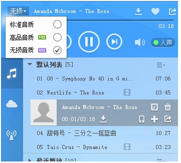 测试的最后,小编发现播放器左上角有个选择按钮,分为标准音质、高品质音质和无损音质,而这只是上代酷狗产品的延续,广大用户可以通过选择来聆听最好的声音。小编于是又重新测试了下,相对于标准音质和高品质音质,无损音质声音更清晰,更立体,更自然。