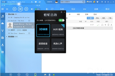 电影已经从2D进化至3D了,也许我们要感谢卡梅隆,不过将音乐进化成3D的酷狗“蝰蛇”音效版播放器,我们也必须山呼万岁,小编在通过《The Rose》这首歌的时候,轻柔的女声,就仿佛Amanda Mcbroom在我耳边轻唱。音乐已不在耳朵了,已经在脑中,哦不,在心里颤动。那股不怕伤害,不怕疼痛,依旧勇于追求爱情,追求幸福的炽热情感喷涌而出,直听得泪流满面。