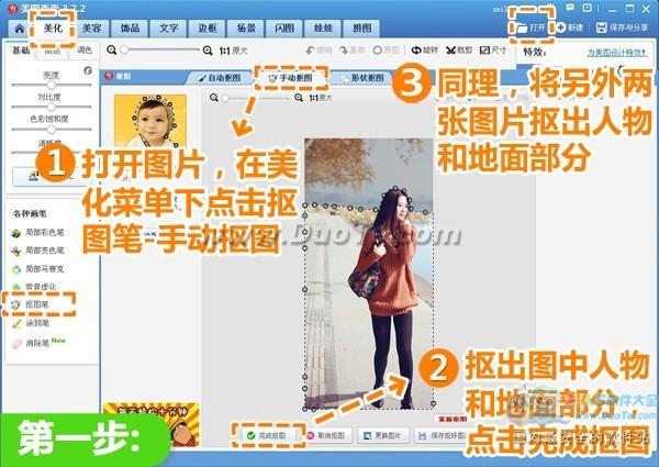 1、 在软件下打开待处理的照片,在“美化”菜单下,点击“抠图笔-手动抠图”按钮,抠出图中人物和地面部分,然后点击“完成抠图”按钮。同理,将另外两张图片抠出人物和地面部分。