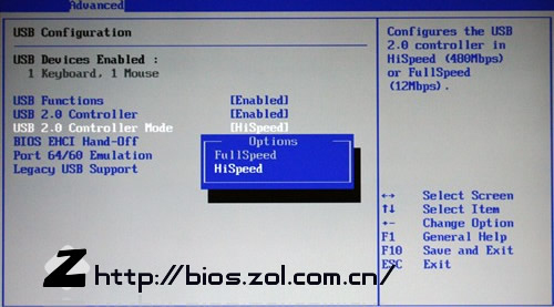 第二项是USB 2.0控制器调节,如果选择Enabled,USB接口就会工作在USB 2.0的传输模式下,如果Disabled,就会被降级为USB 1.1,速度会慢很多。想必绝大多数用户都会Enabled此项吧!下一个是USB 2.0控制器工作模式,有高速模式和全速模式两种选择,不过此项意义不大。