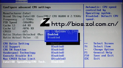 其他的几个选项用处都不大,最后一个项目是Intel有名的SpeedStep技术,如果开启此技术的话,可以实现CPU在空闲时自动降频,从而节省电能,强烈推荐笔记本用户开启此选项。