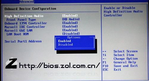 此菜单里主要讲述的是一些集成在主板上的设备,包括声卡、网卡、1394控制器等设备。有一天,你突然发现声卡消失了,或者网卡消失了,那么你就应该来BIOS里看看这里是不是被屏蔽了。上图正在调节高保真音频,如果你没有独立声卡的话,就选择Enabled吧。
