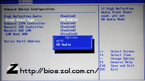 Front Panel Type讲的是前置音频的类型,可以设置成AC 97或者是HD Audio。如果你家里没有5.1声道以上音响设备的话,建议设置成AC97,因为这样前后的音频才是独立的。如果选择HD Audio的话,前置音频只能作为5.1声道系统中的两个小音箱。