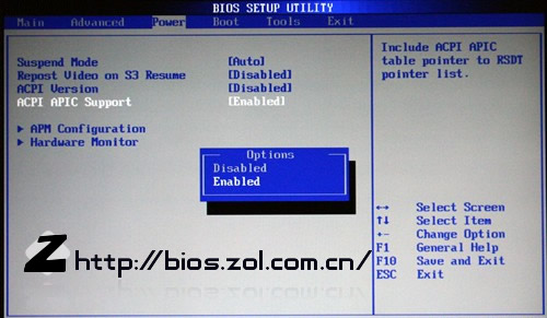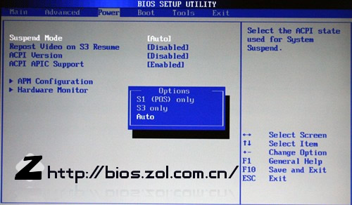 Power菜单里第一项是挂起模式,对于PC机来说,建议选择S3 only或者Auto,而对于POS机来说,则建议选择S1。