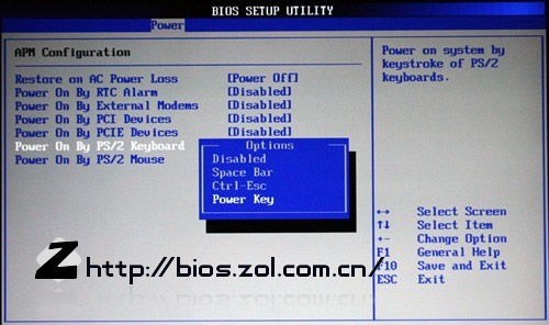 上图就是键盘开机的设置界面,这里有3种选择,分别是Space Bar(空格键),Ctrl-Esc,Power Key(键盘上的Power键)。当你选择相应的(组合)键之后,下次开计算机就可以直接通过相应的按键来开启了。