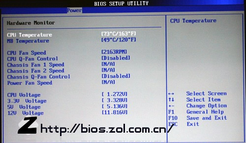 一般来说,Power菜单里还有个硬件监控页面,这个页面里显示了当前CPU、主板等设备温度、电压、风扇转速等内容,在某些时候也可以根据这里排除一些故障。